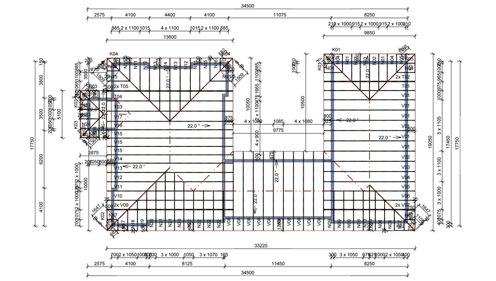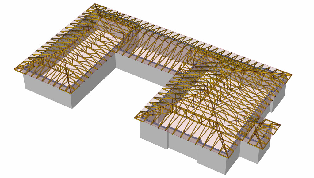 Veľká väzníková strecha valbového typu s pôdorysom v tvare písmena „U“ pre rodinný dom v obci Jurová. Väzníkový krov tvoria štyri úžľabia 12 strešných rovín vrátane malého prístrešku na vstupom. Sklon všetkých strešných rovín je 22°.